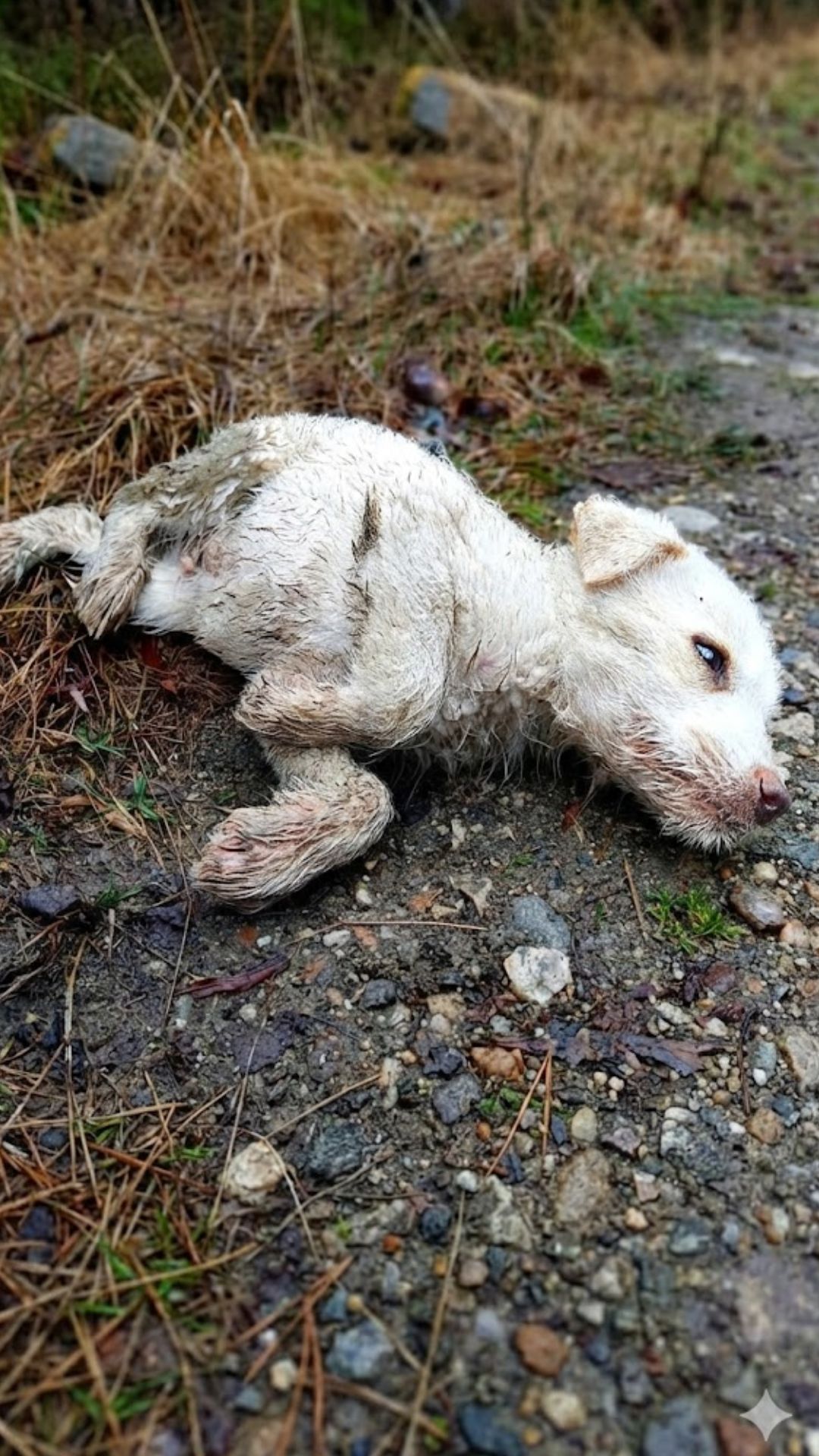 A small white puppy lay motionless beside a busy road, cars rushing past, dust rising around his tiny body. He didn’t flinch. He didn’t cry.
