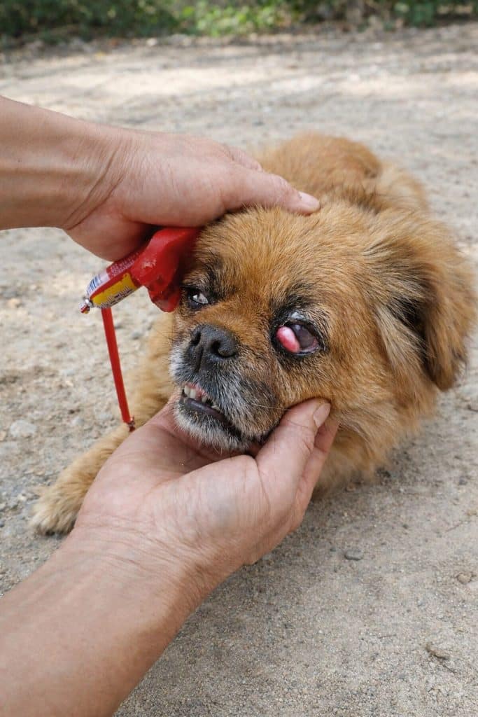 The surrounding skin looks irritated, stretched, and painful. He struggles to open the eye fully — and when he tries, the effort shows across his entire expression.