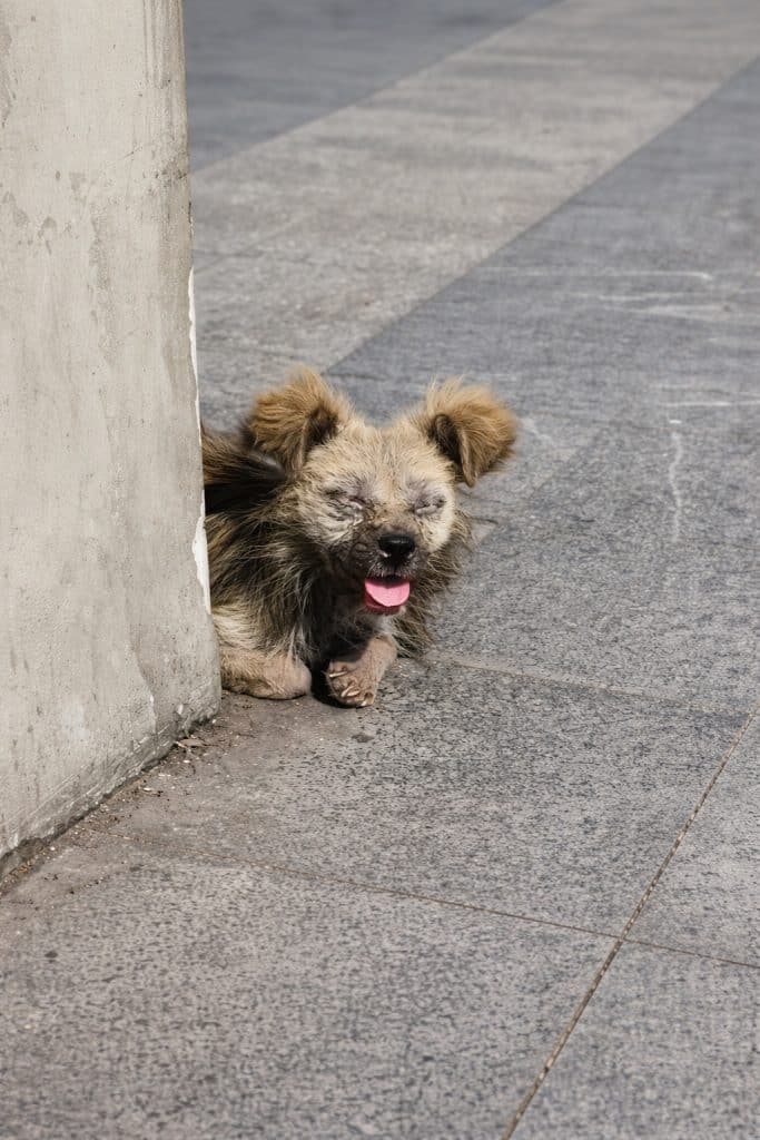 Both eyes are heavily inflamed. Layers of dried discharge have built up over time, sealing them shut. Without intervention, permanent blindness would almost certainly follow.