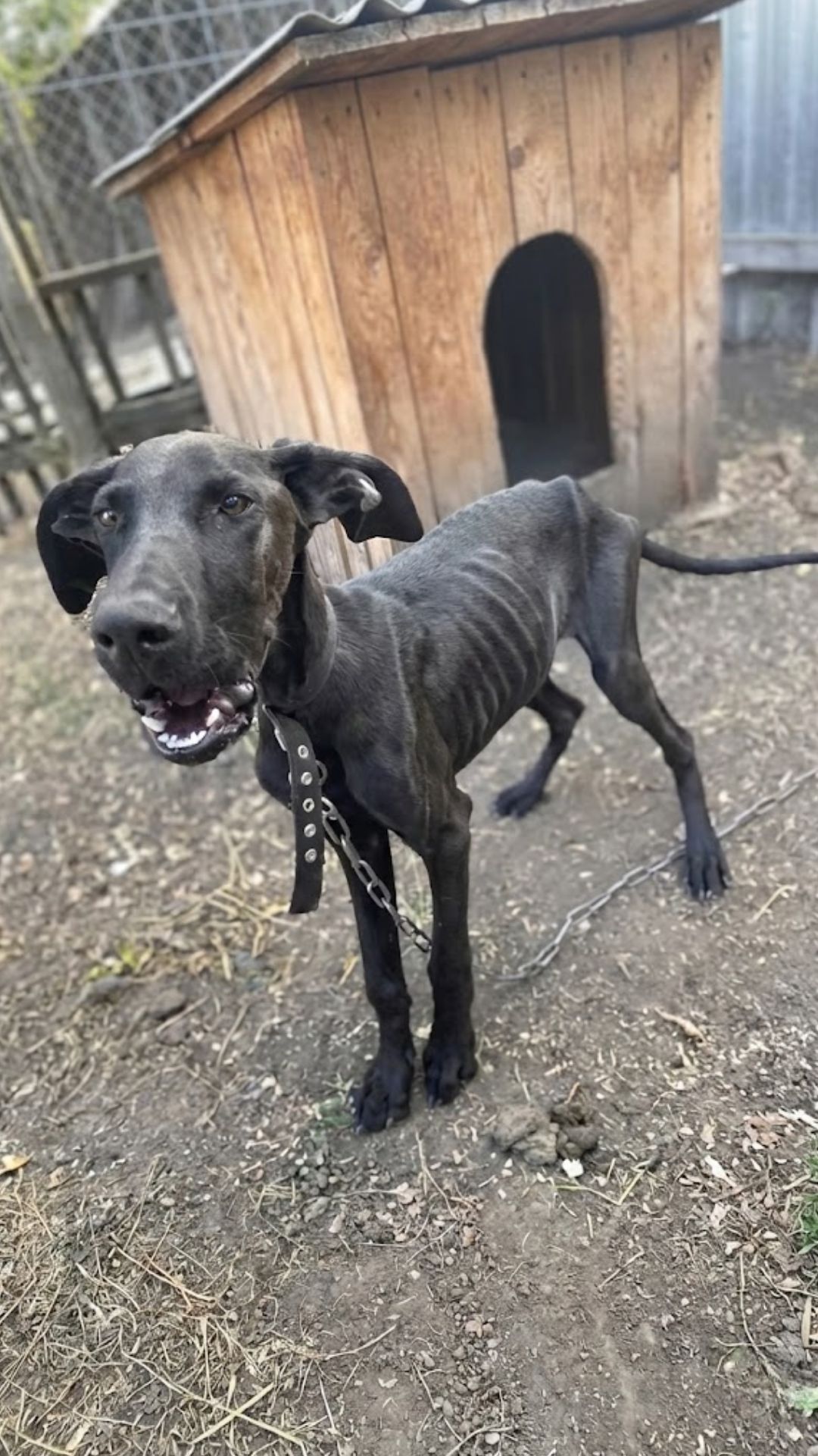 Tied tightly to a short rope was a five-month-old puppy so thin he looked almost unreal. His ribs pushed sharply against his skin, and his legs trembled as he tried to stand.