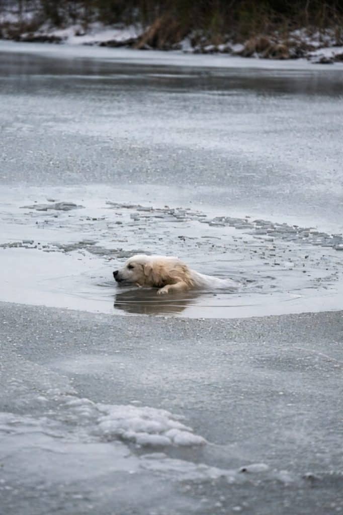 A small puppy, trapped in a pocket of dark water surrounded by ice, struggled to stay above the surface.