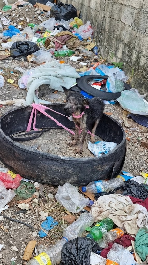 Her name is Omar, and she wasn’t wandering through the trash by accident. She had been deliberately abandoned—tied to an old tire with a rope so short, less than a single meter, that she could not escape no matter how hard she tried.