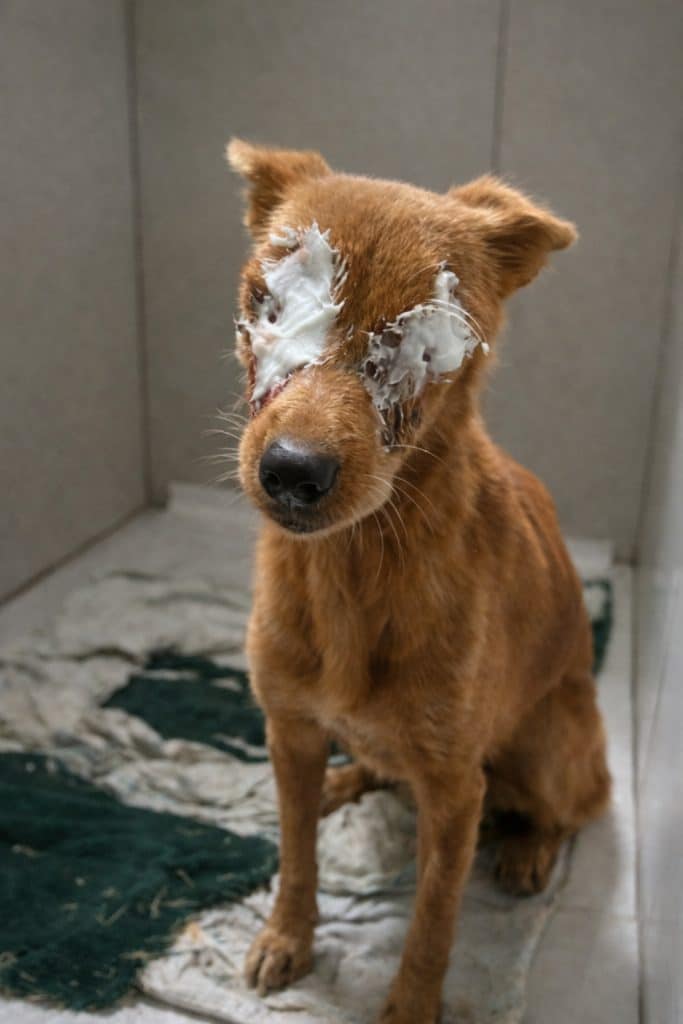 They were swollen shut, covered in thick discharge, making it almost impossible for him to see. The irritation appeared severe—likely caused by exposure to a harmful substance. Someone had attempted to treat it using a human eye gel, but instead of helping, it had worsened the infection.