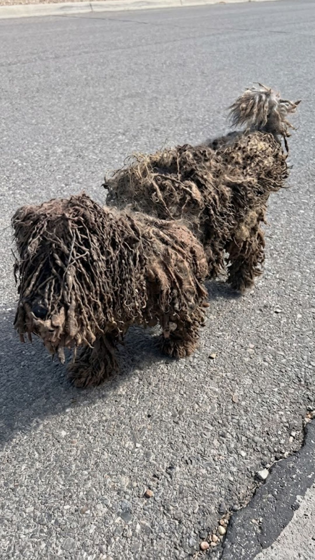 Her fur was so tightly matted that it formed heavy clumps across her entire body. Dirt had hardened into the coat, and it was impossible to tell what she originally looked like.