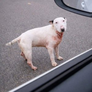 It happened on a quiet countryside road. No traffic.No noise.Just open space—and a single dog walking alone. A white Bull Terrier. Thin.Tired.Moving slowly, as if every step…