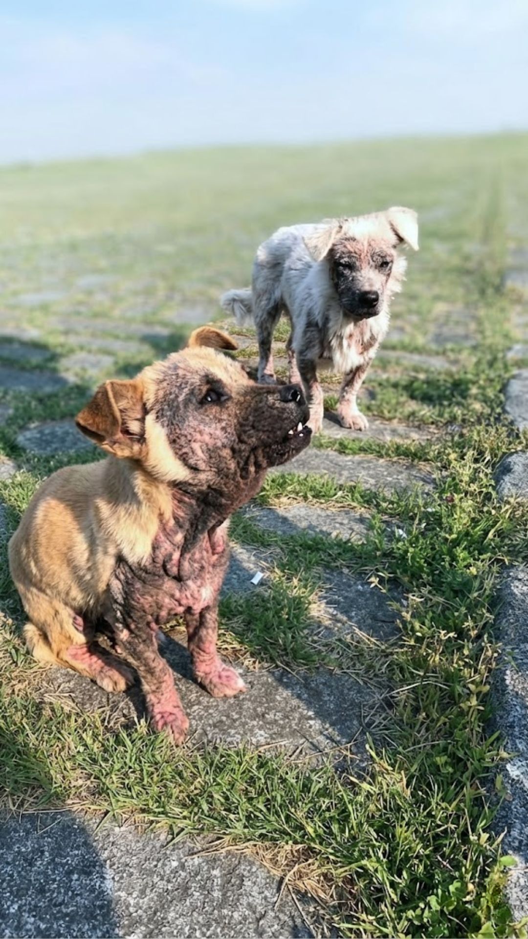 The dogs were confirmed to be young brothers, both around a year old. Their severe skin conditions were caused by untreated mange and parasites, leaving their bodies painfully irritated and vulnerable.