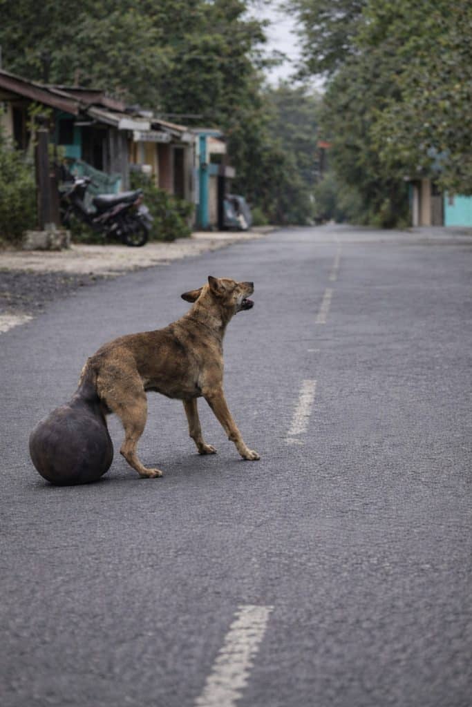 Attached to her hind leg was a large, swollen mass—so heavy that every step looked slow and painful.