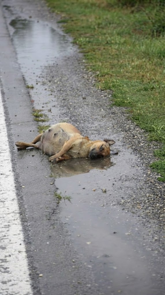 Lisa’s story began beside a dusty rural road, where a heavily pregnant stray dog lay motionless. Her body was thin and injured, her breathing shallow. There were signs she had been struggling for a long time—marks of neglect, exhaustion, and fear.