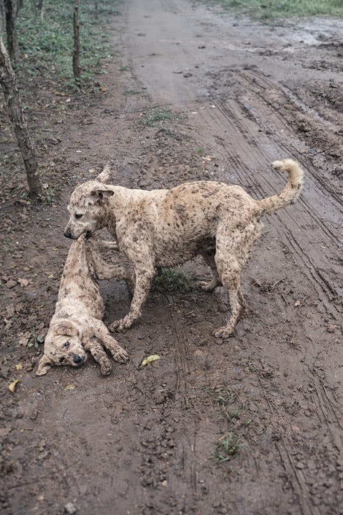 On damp ground, under soft light, a white mother dog stood beside her puppy.