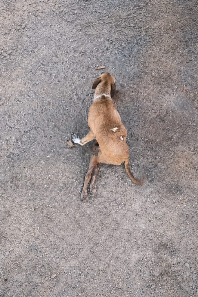 She dragged them behind her as her front legs pulled her body forward, leaving faint marks on the pavement. Every movement looked exhausting.