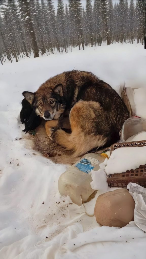 Curled into a shallow hollow carved into the snow lay a mother dog. Her body shook violently from cold and exhaustion. Frost clung to her fur. Her breathing was shallow, strained.