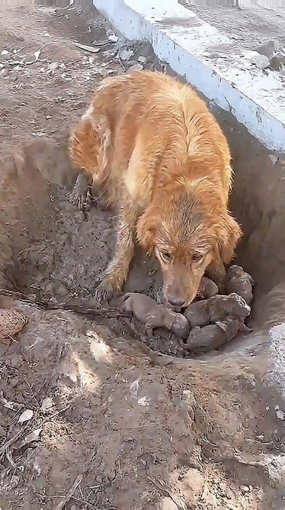 When she was first seen, the mother dog lay in a shallow pit of wet earth, her body heavy with exhaustion. Thick chains were still wrapped around her neck, pressing into her skin. Her puppies — only days old — rolled beside her, soaked and trembling, their tiny bodies coated in dirt.