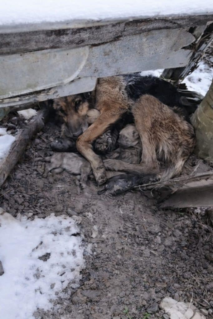 So she found the only place she could — beneath construction scraps and broken wood, where the wind was slightly weaker and the cold ground became the place her puppies entered the world.