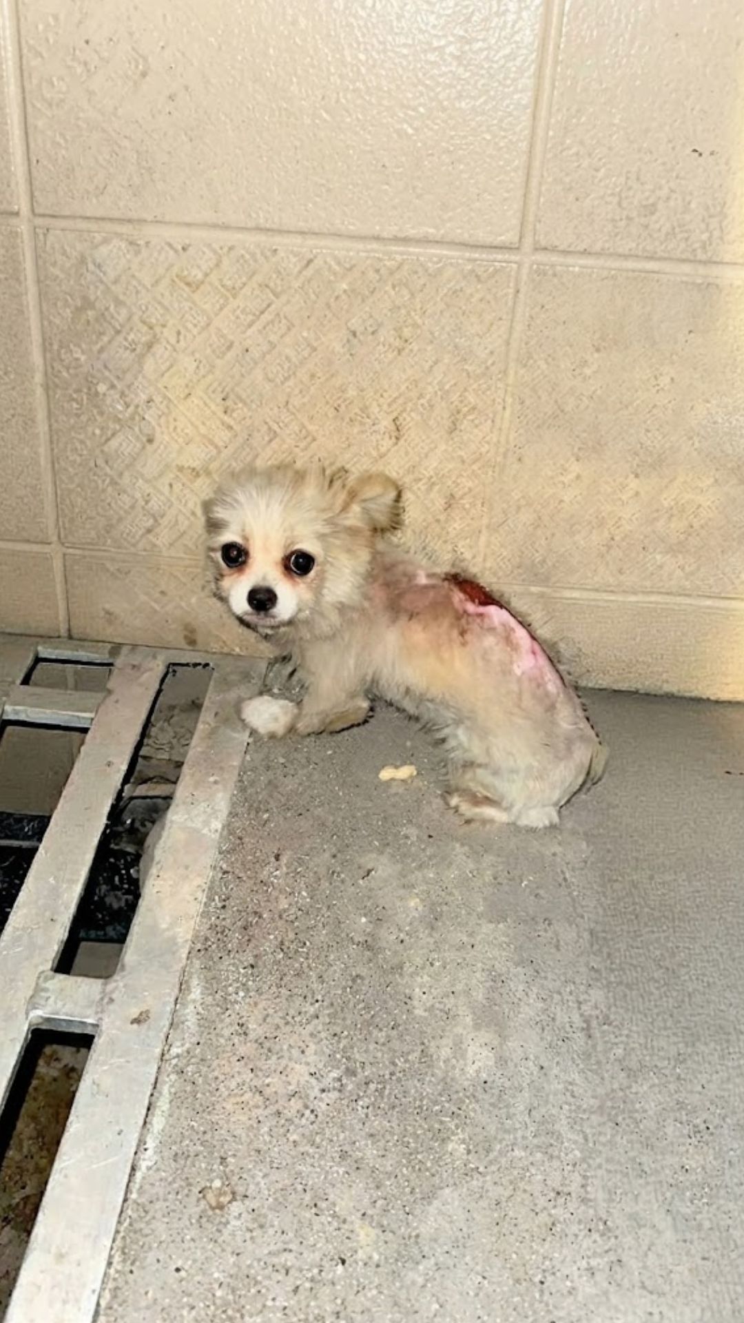 The dog scrambled away, disappearing into a narrow alley beside the building. But she didn’t run far. She couldn’t.