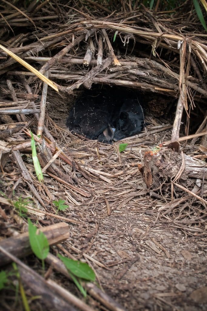 Hidden beneath a hillside, tucked deep inside a natural burrow surrounded by thick bushes, she lay curled around her newborn puppies.