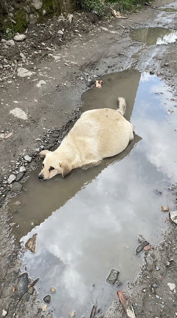 That morning, a heavily pregnant dog was found sitting in shallow water near the edge of a quiet road.