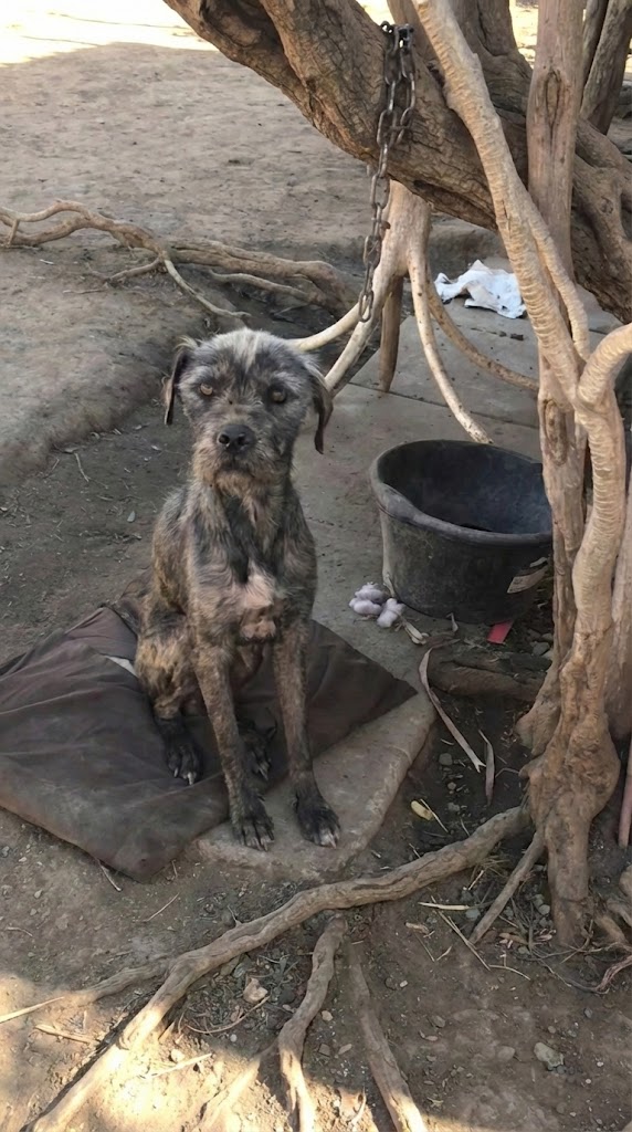 When rescuers arrived at a rural property after a call about a mother dog and her puppies, the scene was hard to take in. A young Beagle-mix mama stood in the dirt, ribs visible beneath a thin coat. Around her neck hung a chain so heavy it seemed to pull her head down.