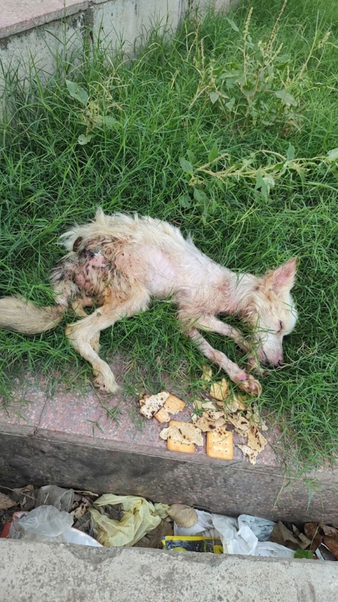 Her small body was covered in dirt and blood. The smell of neglect clung to her tangled fur, and her fragile frame trembled uncontrollably.