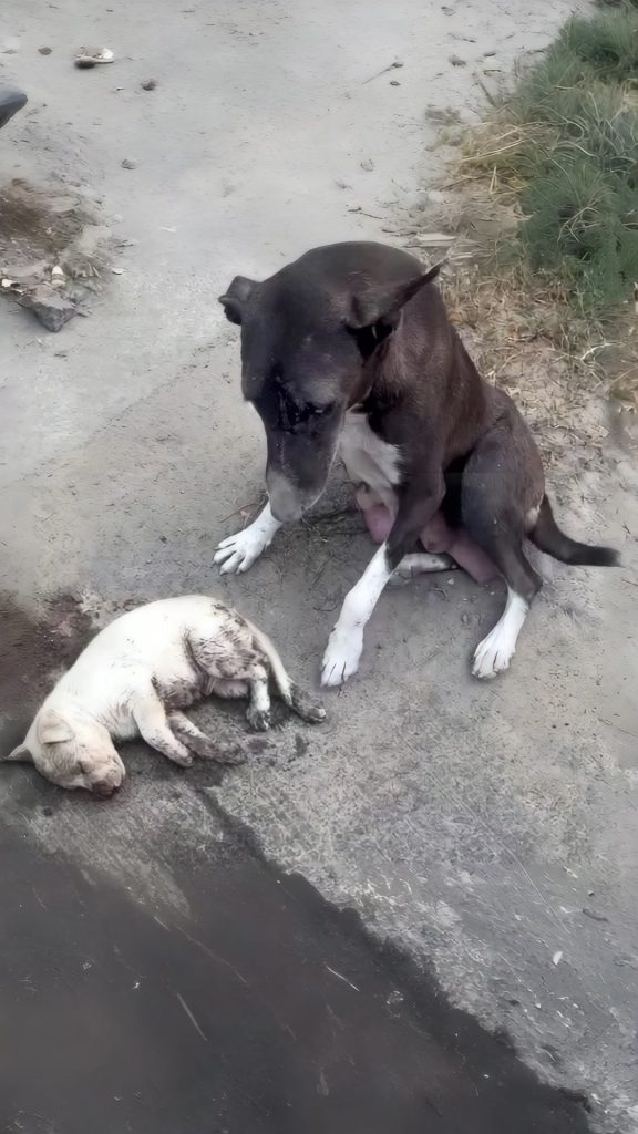 She didn’t pace or panic. She didn’t bark or chase passing cars. She simply stood there—still, tense, unwavering—her body forming a barrier between her puppy and the world. Her eyes followed every movement around them, carrying a single silent question: Will anyone help my baby?