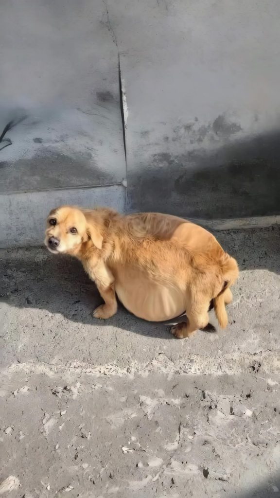 On a bitter winter day, when the streets felt unusually still, a lone dog wandered through a quiet residential neighborhood with no clear destination. Each step looked heavier than the last, as though her body was moving on strength that was nearly gone. She was painfully thin, her frame fragile, yet her abdomen was visibly swollen, making every movement slow and uncomfortable.