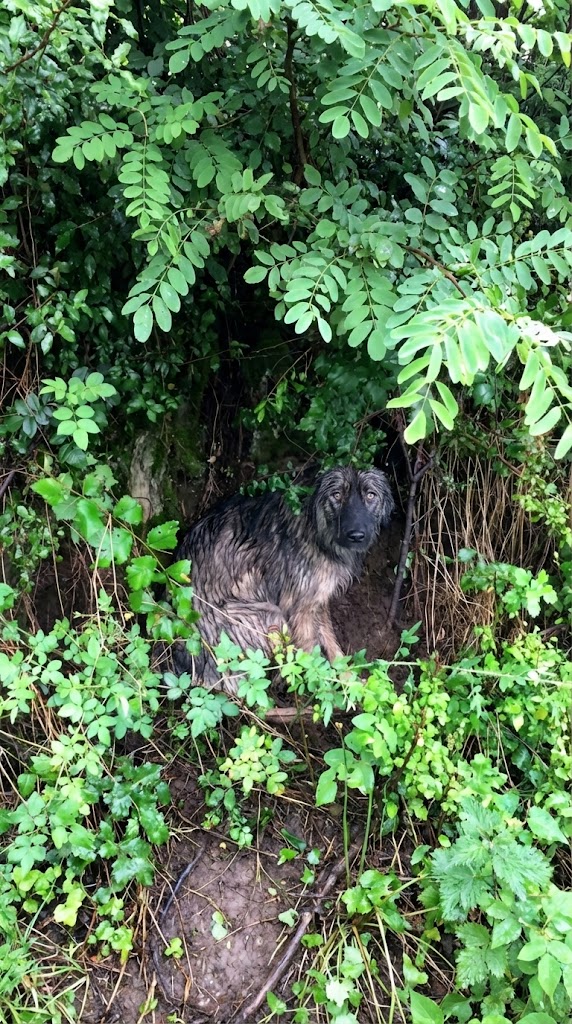 The sky above a quiet roadside in Serbia hung low and heavy with rain. Cars rushed past, tires slicing through muddy water. Beneath a tangle of overgrown bushes, a small dog sat perfectly still.