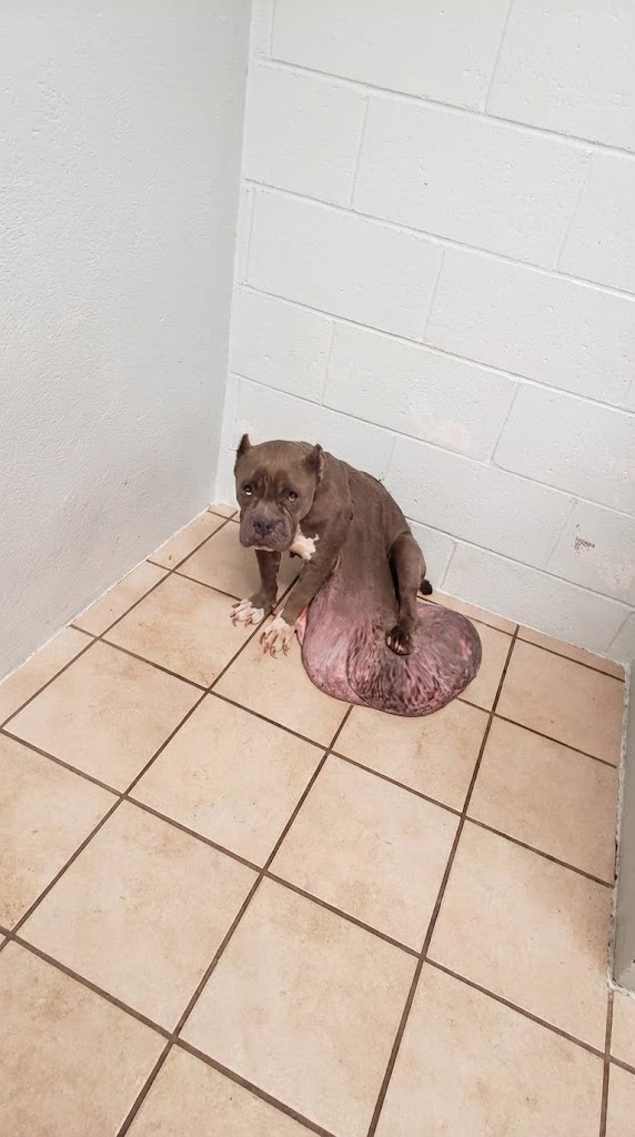 Before anyone knew her name, she wandered the streets alone—thin, exhausted, and struggling under a weight no living creature should have to carry. A massive tumor hung heavily from her side, pulling at her body with every step. It slowed her movements, drained her strength, and made even standing an effort.