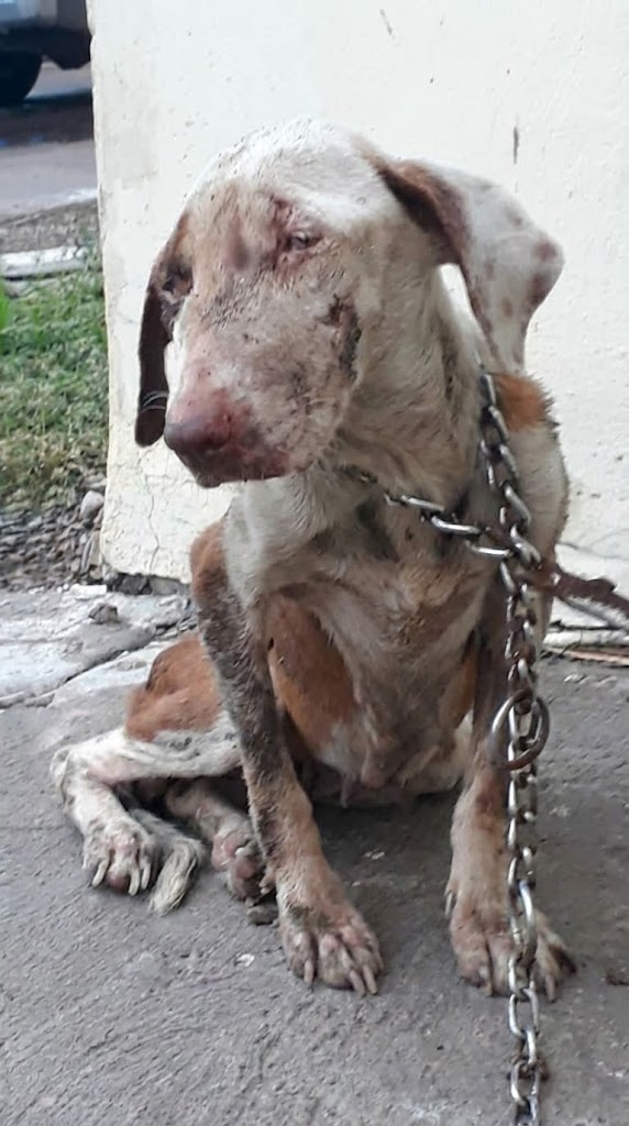Day after day, Zelda waited in the same place, listening for footsteps that never returned. Hunger became routine. Loneliness settled into her bones. Her once-smooth coat dulled, her body grew thin, and her world shrank to the length of the chain around her neck.