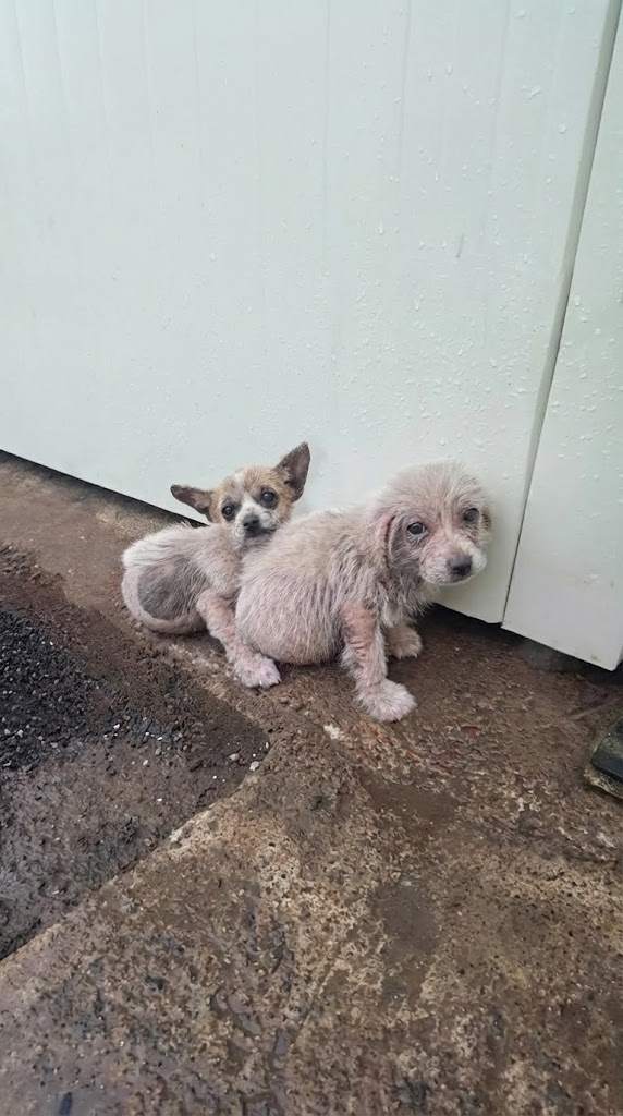 Two tiny puppies were pressed tightly against their mother, their bodies shaking as cold rain seeped through the thin cover above them. Their fur was sparse and dull, their ribs faintly visible beneath fragile skin. Wide eyes looked out from the shadows—confused, frightened, and painfully aware of how exposed they were.