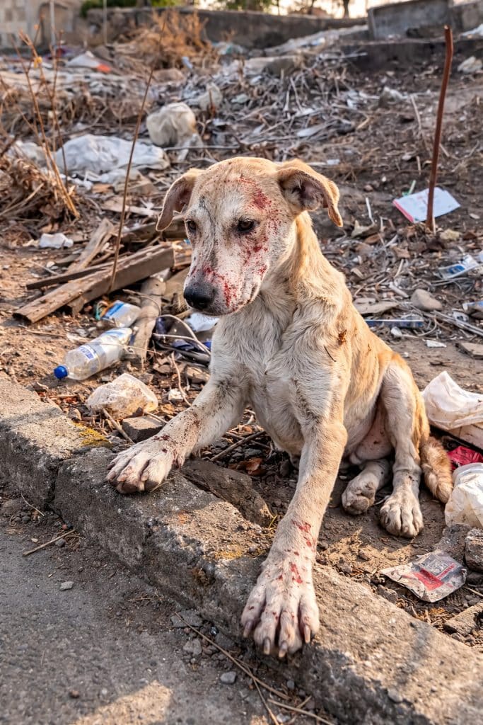He placed his two front paws on the edge of a low concrete wall, stretching upward as if trying to see beyond the trash that surrounded him.