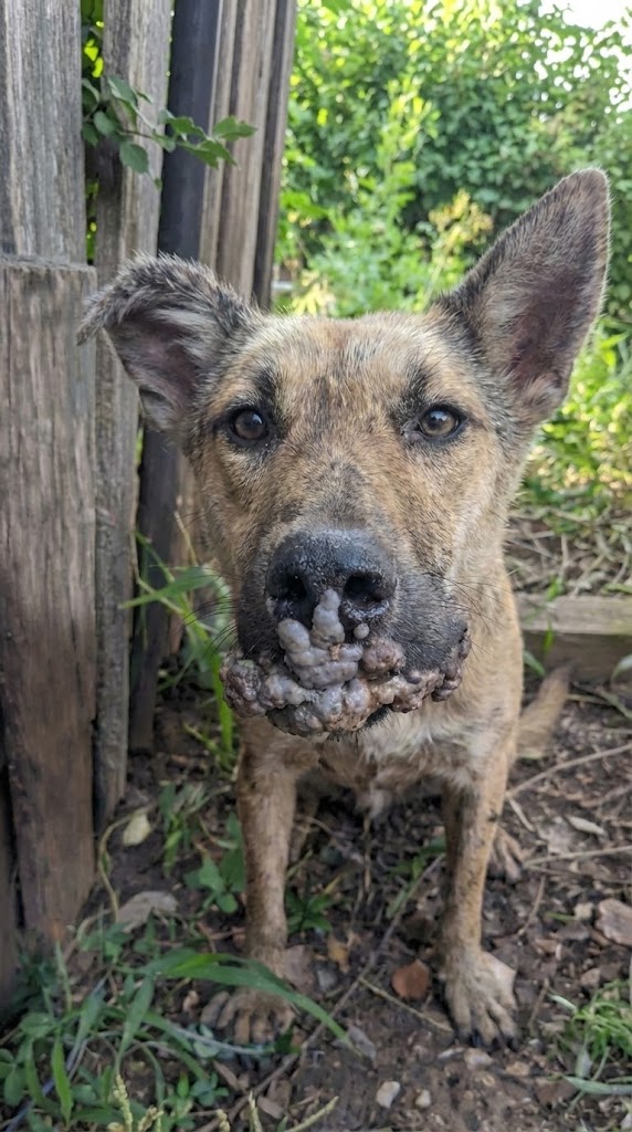 For a long time, Nossa had existed on the streets in complete silence. Hunger weakened her body, but it was pain that finally stopped her. Her mouth was covered in aggressive, swollen growths caused by a severe Papillomavirus infection. These tumors weren’t just visible—they were crippling. Eating hurt. Drinking hurt. Even opening her mouth felt like torture.