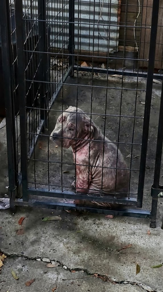 When Mike and his crew returned, the sight was worse than before. The rain had intensified. The dog—later named Chunk—had almost no fur to protect her. Her skin was raw, scabbed, and inflamed from severe mange. Each shiver looked like it might be her last.