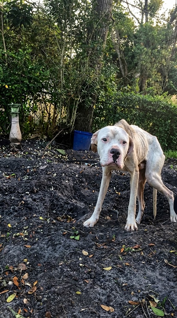 In a quiet backyard in Liberty City, Miami, a Dogo Argentino mix was slowly disappearing. For nearly three months, while neighbors went to work and children played down the street, he stood tied to a tree — trapped inside a shrinking circle of dirt.