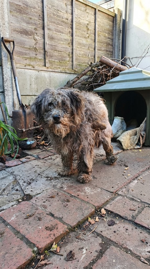 When she was first found, it was difficult to see the dog beneath the years. Her fur had grown into thick, tangled mats that weighed heavily against her small body. She moved slowly, cautiously — as if the world had already asked too much of her.