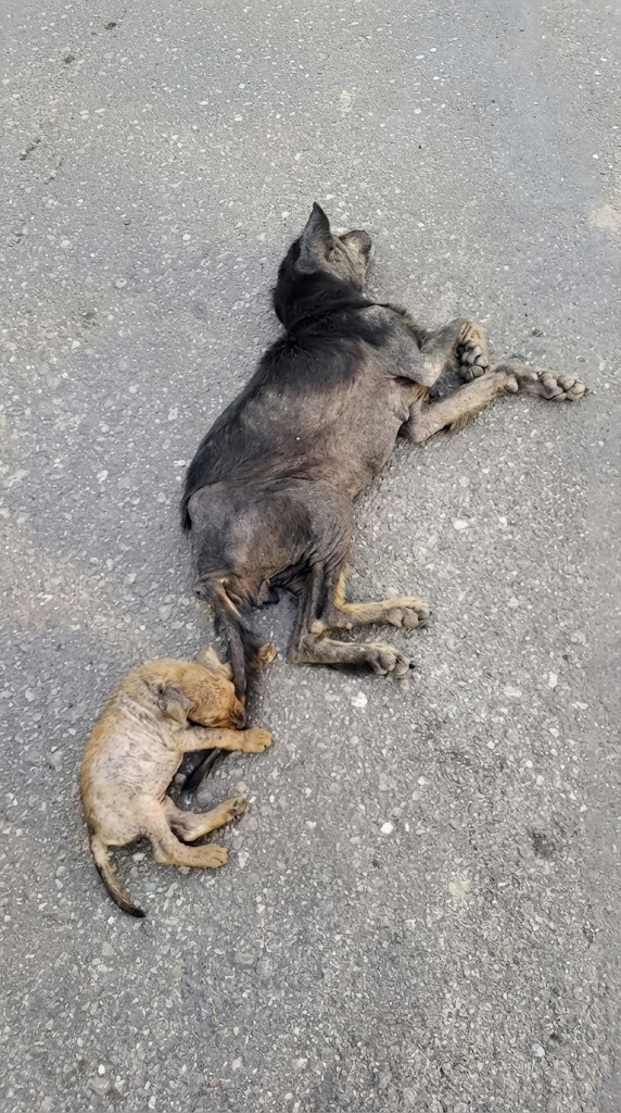 In a dusty corner of a village where compassion had long gone quiet, a frail mother dog lay collapsed on the ground.