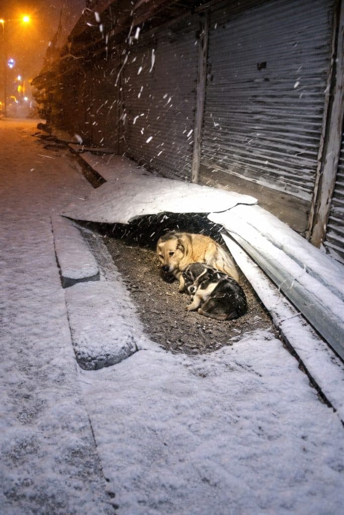 Two dogs began the night hiding beneath scrap wood in the snow.