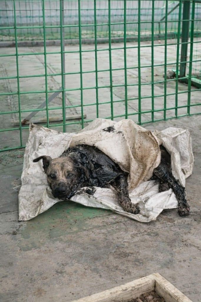 They applied oil-soaked bandages every few hours to soften the remaining asphalt without stressing her further.
