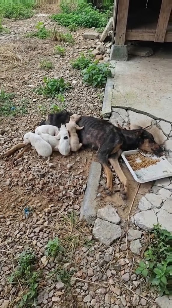 She was starving. Severely anemic. So weak she struggled even to lift her head. And yet, when one of her puppies whimpered, she responded immediately—licking gently, pressing her body closer, refusing to let go.