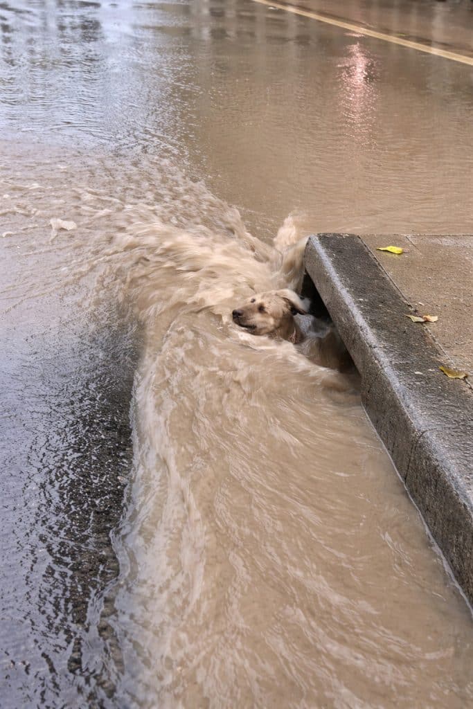 During heavy rain, dog was drowning.